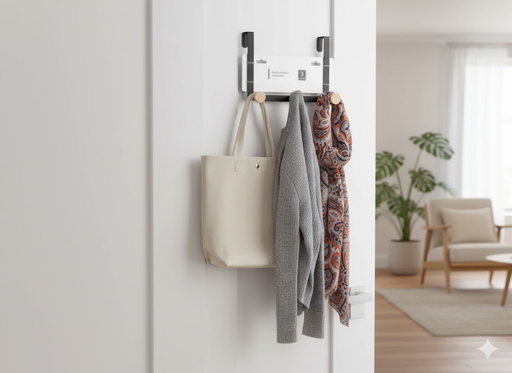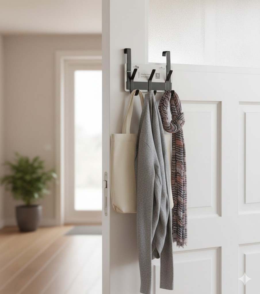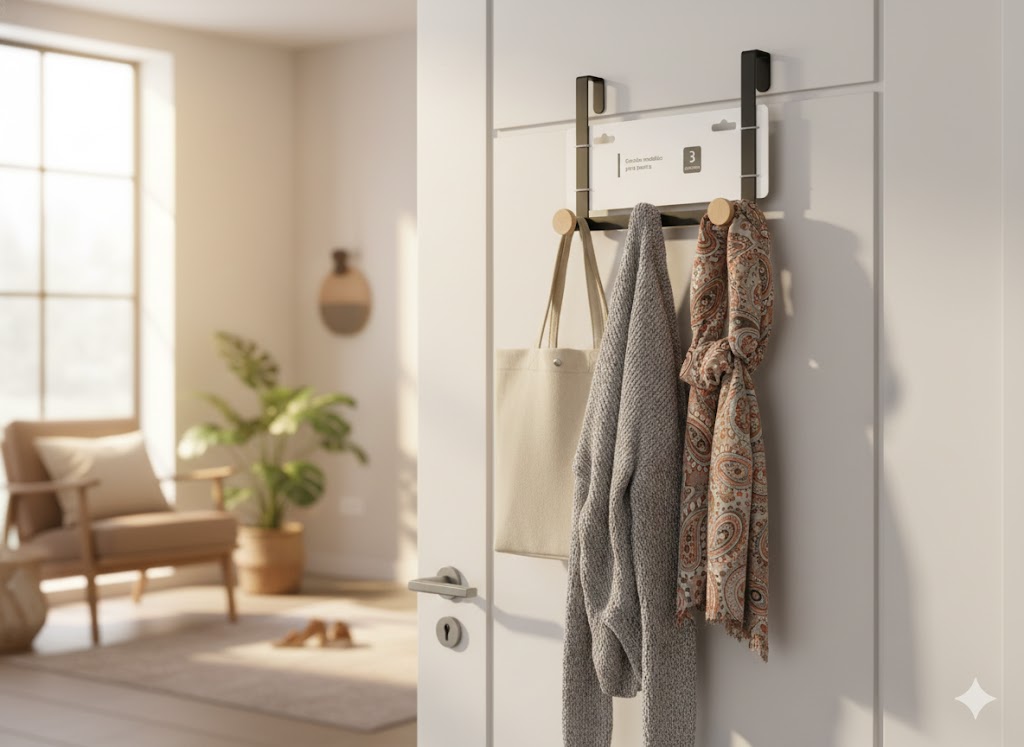 Organizá tus espacios al instante con este **perchero metálico para puerta con 3 ganchos de madera**, ideal para dormitorios, baños, cocinas, vestidores u oficinas.