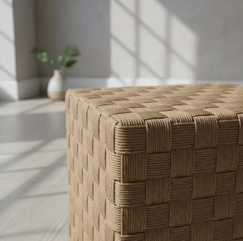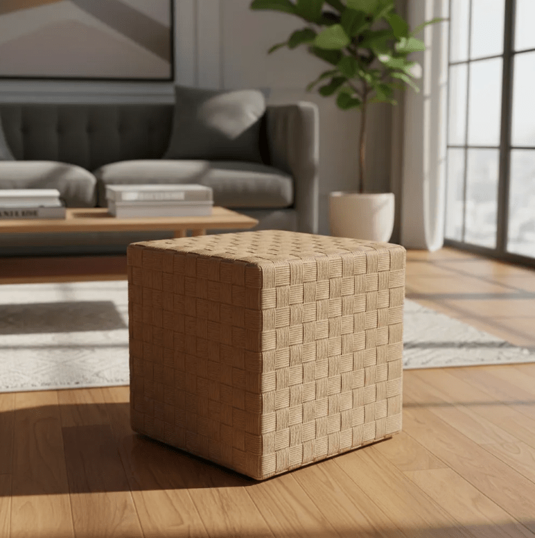 Puff cubo artesanal con estructura de madera sólida y revestimiento tejido en papel kraft, ideal para sumar calidez, diseño y funcionalidad a tus ambientes.