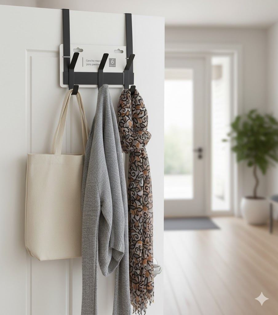 Organizá tus espacios al instante con este **perchero metálico para puerta con 6 ganchos**, ideal para dormitorios, baños, cocinas, vestidores u oficinas.